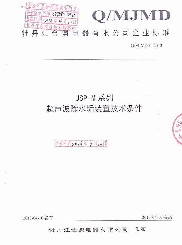 2013年4月10日,牡丹江金盟電器有限公司《USP-M系列超聲波除水垢裝置技術(shù)條件》正式通過(guò)技術(shù)監(jiān)督局審核通過(guò),同時(shí)發(fā)布并實(shí)施。