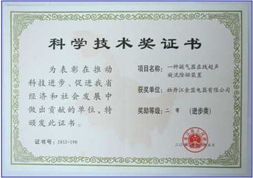 2010年,“一種凝汽器在線超聲波旋流除垢裝置”在電力系統(tǒng)200MW機組凝汽器安裝使用,填補了國內空白,該項目于2012年獲得黑龍江省人民政府 “科學技術二等獎”,2013年,獲得國內“首臺套獎勵”。